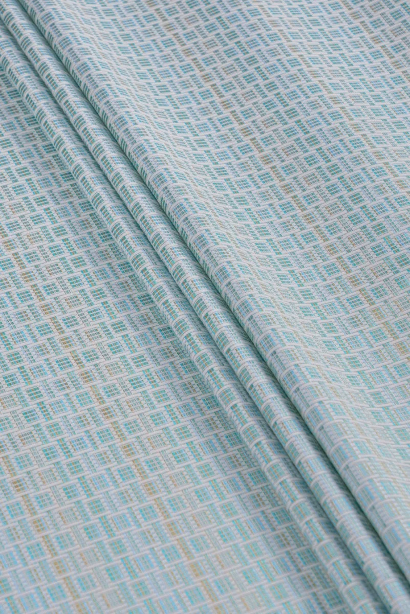 Італійська жакардова костюмна тканина білого і бірюзового кольорів з вплетеною в неї бежевою ниткою. У матеріалі є дуже цікавий мотив маленької клітинки - кубики, які утворюють вертикальні смуги. Тканина злегка блискуча, м'ясиста, злегка жорстка - відмінно підійде для пошиття сукні, спідниці, костюма або пальто.