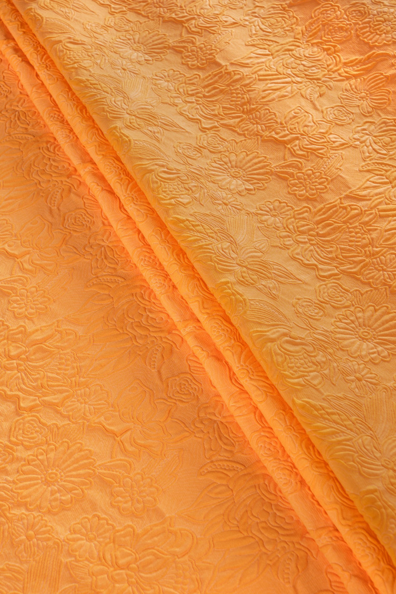 Італійська жакардова костюмна тканина з щільним мотивом вичавлених квітів. Весь витриманий в красивому помаранчевому кольорі. Тканина нееластична, жорстка, дуже ефективна. Він відмінно підійде для пошиття весняного пальто, гламурного костюма або сукні.