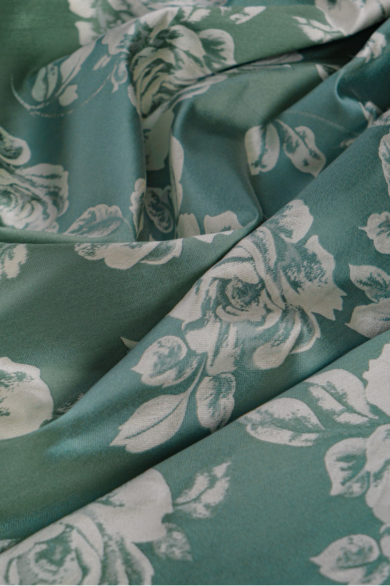Італійська жакардова костюмна тканина з мотивом квітки троянди, розміром близько 30 см. Тканина двостороння: з одного боку темно-м'ятний з квітками екрю і з іншого боку з екрю з темними квітками м'яти. Тканина більш щільна, жорстка, нееластична з характерним блиском. Відмінно підійде для пошиття сукні, костюма, спідниці або в декоративних цілях.