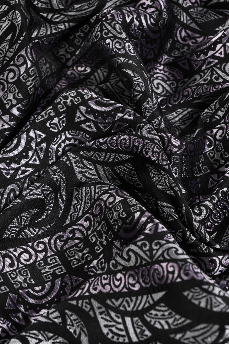 Італійська жакардова костюмна тканина зі східними мотивами, що утворюють горизонтальні смуги шириною 12 см. Гарне поєднання чорного, сірого та брудно-фіолетового. Фон тканини матовий, а малюнок злегка блискучий. Тканина більш щільна, жорстка, нееластична з характерним блиском. Відмінно підійде для пошиття сукні, костюма, спідниці або в декоративних цілях.