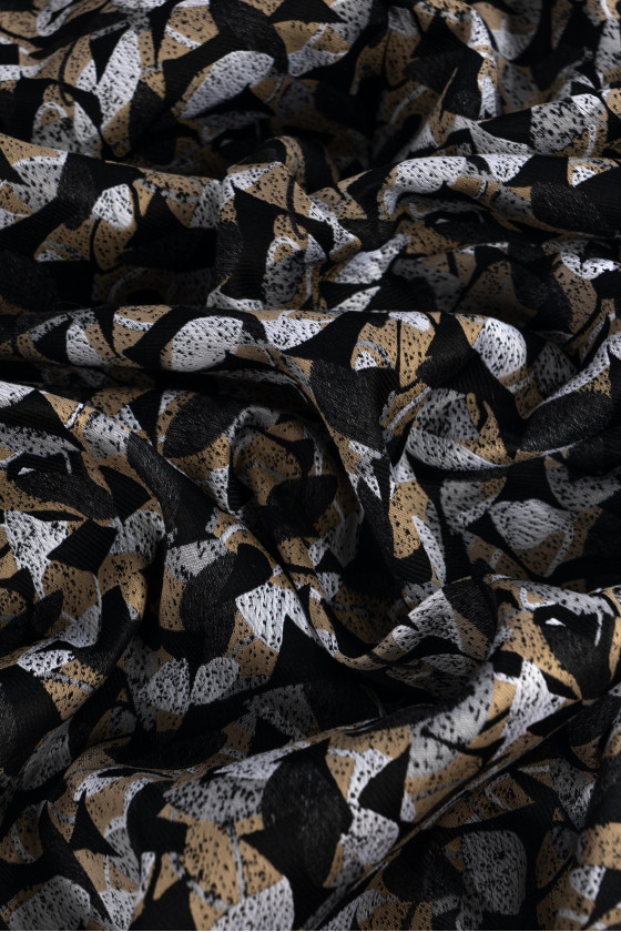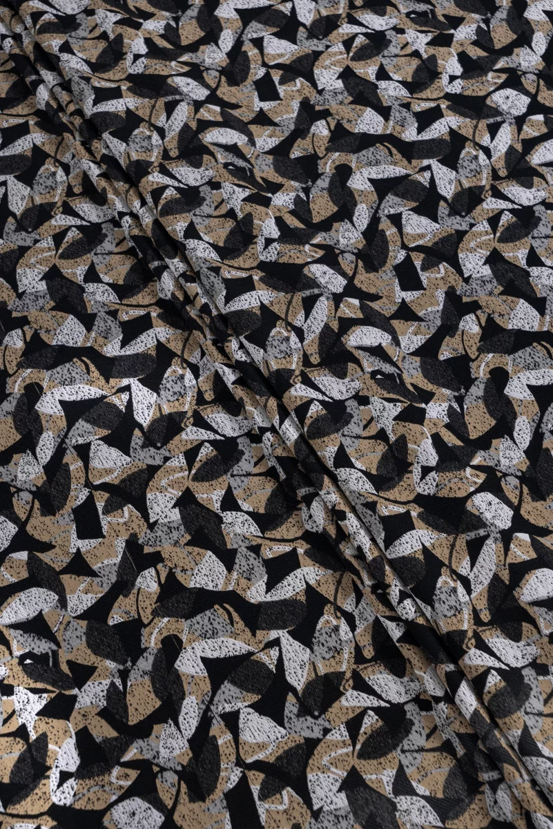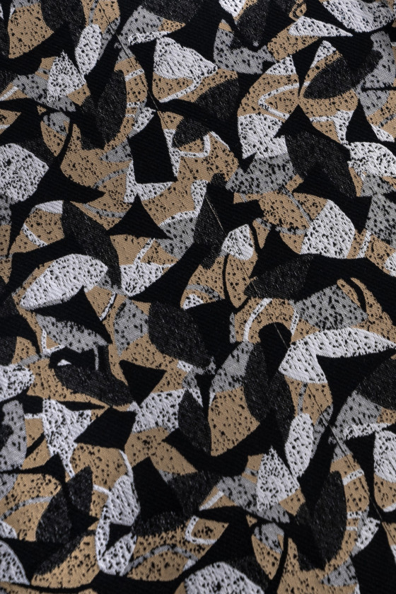 Італійська жакардова костюмна тканина чорного кольору з химерними візерунками сірого, бежевого та екрю. Тонка, злегка жорстка тканина з саржевим переплетенням.