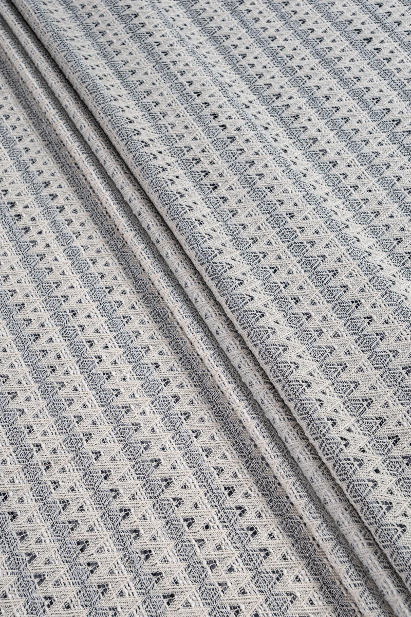 Італійська жакардова костюмна тканина сірого кольору та екрю з мотивом маленьких ромбів, розташованих горизонтальними смугами. Тканина більш щільна, жорстка, схожа на переплетення тканини шанель.