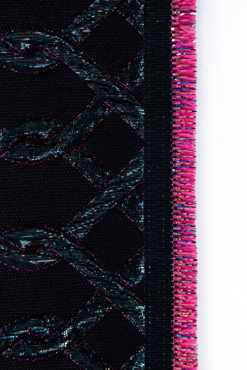 Італійська жакардова костюмна тканина чорно-рожевого кольору з тисненням, що нагадує переплетену нитку, красиво прикрашена різнокольоровою люрексовою ниткою. Тканина більш щільна, м'ясиста, еластична по довжині тканини.