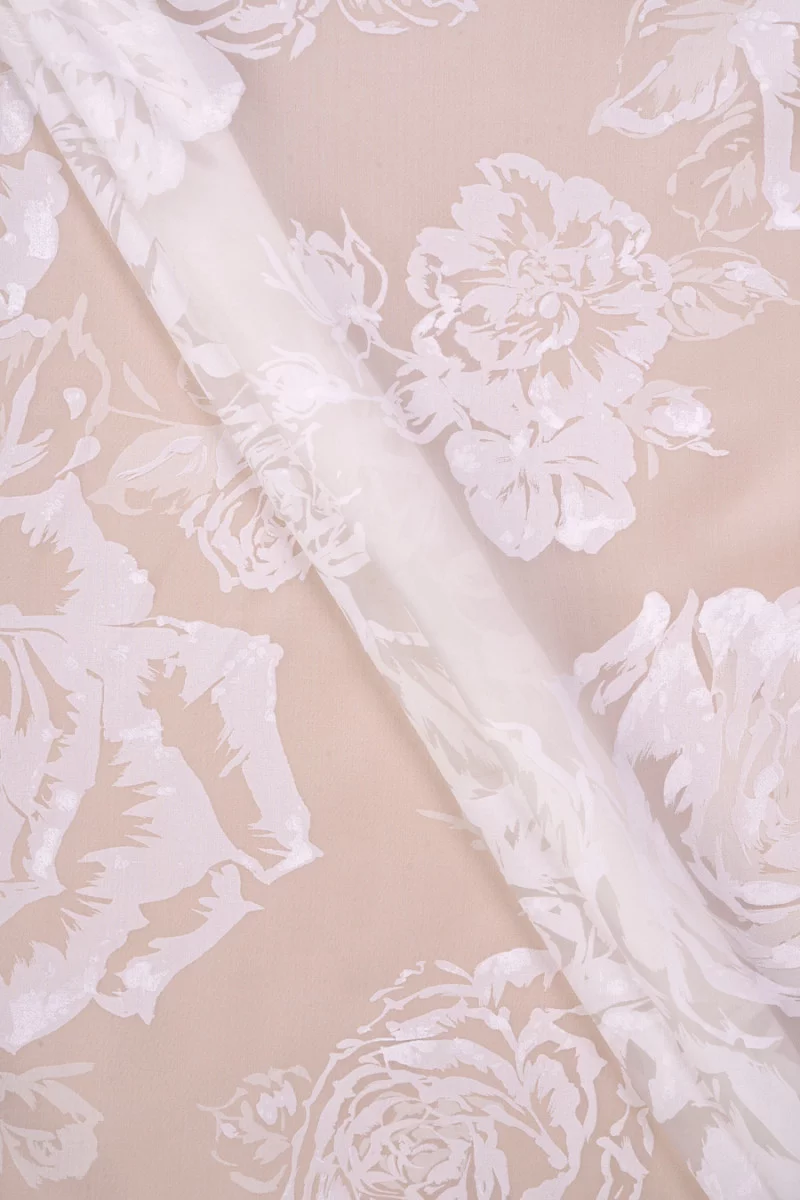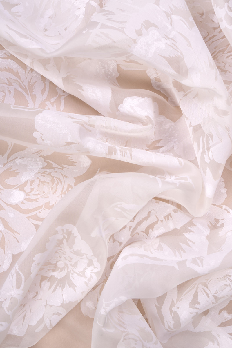 Італійська 100% кремова шовкова тканина з органзи з непрозорими квітами кремової троянди. Органза з натурального шовку - це тонка, прозора, але жорстка тканина з ніжним блиском, характерним для шовкових тканин. Відмінно підійде для пошиття сукні, блузки, сорочки, спідниці.