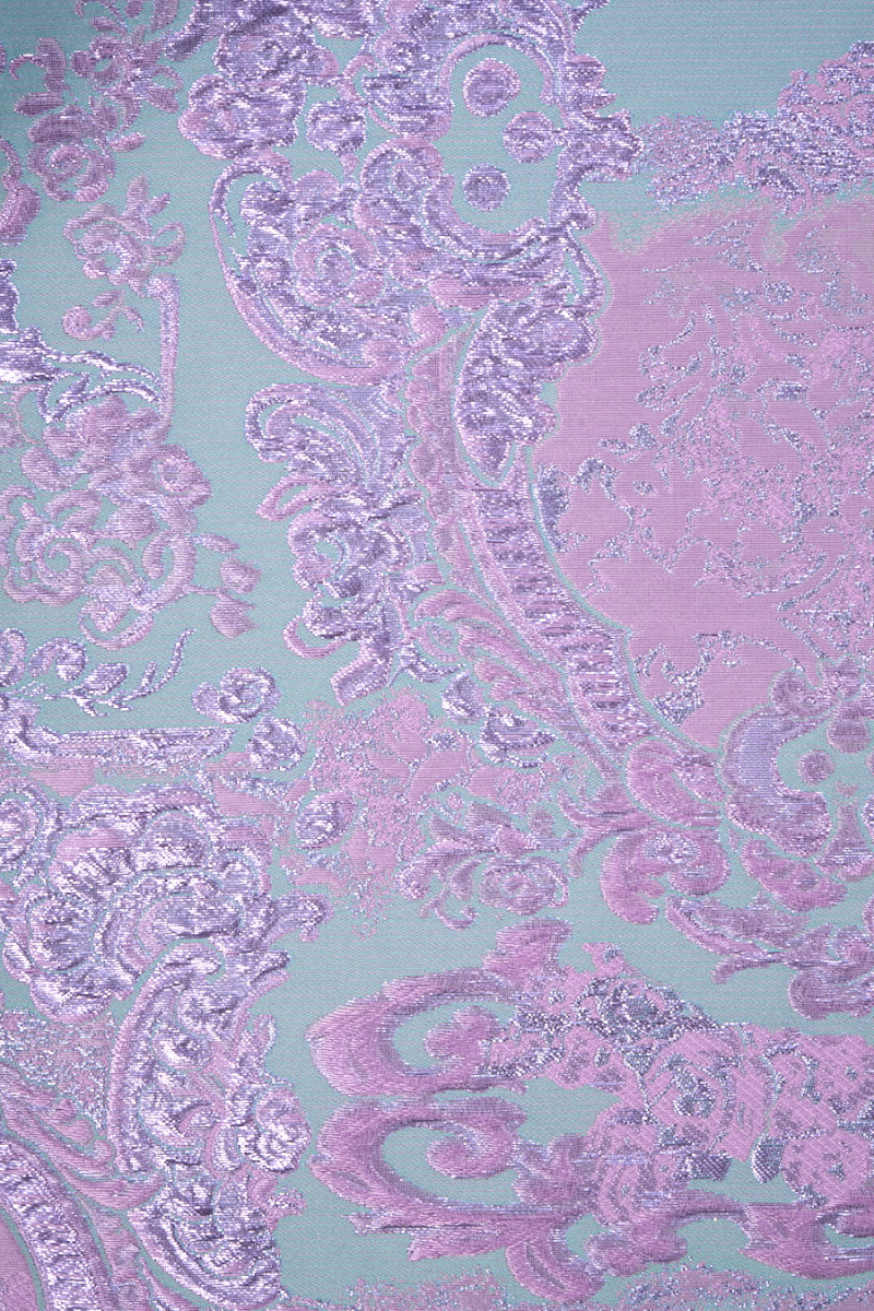 Італійська жакардова костюмна тканина світло-бірюзового кольору з рожево-фіолетовим мотивом східних панно - візерунок окружний. Середньої товщини, непрозора, нееластична, злегка жорстка тканина - відмінно підійде для пошиття сукні, спідниці, костюма або в декоративних цілях.