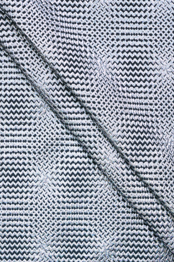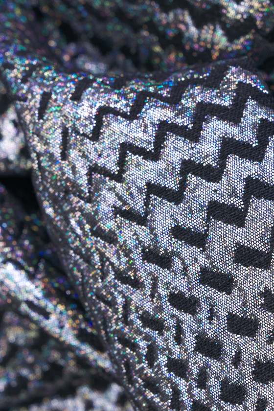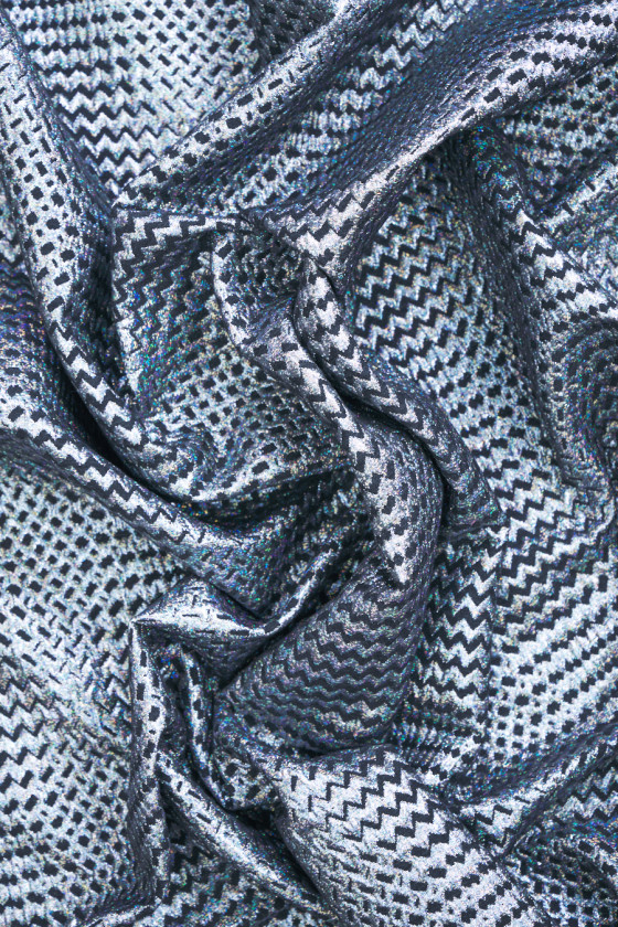 Італійська жакардова костюмна тканина чорного кольору з мотивом дрібних зигзагів. Ніжний візерунок виконаний з різнокольорової нитки, яка переливається цілою палітрою кольорів в залежності від кута падіння світла. Мотив виконаний вертикально і горизонтально, що дозволяє йому створювати тонкий візерунок в клітинку. Тканина може бути пришита з двох сторін, що більш тонко і темно. Матеріал середньої товщини, трохи жорсткий і нееластичний. Прекрасна пропозиція для людей, які люблять блискучі та ефектні тканини.