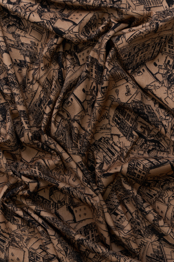 Італійська жакардова костюмна тканина із зображенням карти міста на тлі верблюда. Щільний, повторюваний візерунок, виконаний в чорному кольорі, зображує різні типи будівель і вулиць з їх назвами. Тканина м'яка, еластична, непрозора і добре драпірується. Він відмінно підійде для пошиття костюма, сукні, спідниці і штанів.