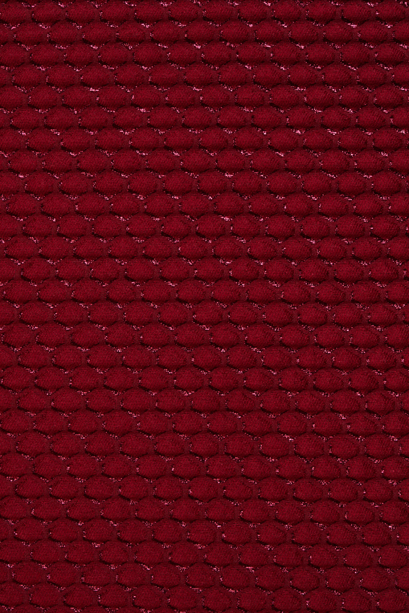 Італійська бордова жакардова тканина з дрібним гексогеновим малюнком, додатково прикрашена блискучою ниткою. Тканина середньої товщини, нееластична, з виразною опуклою структурою, жорстко облягає. Фантастична пропозиція для пошиття костюма, сукні, спідниці або пальто в наймоднішому кольорі цього сезону.