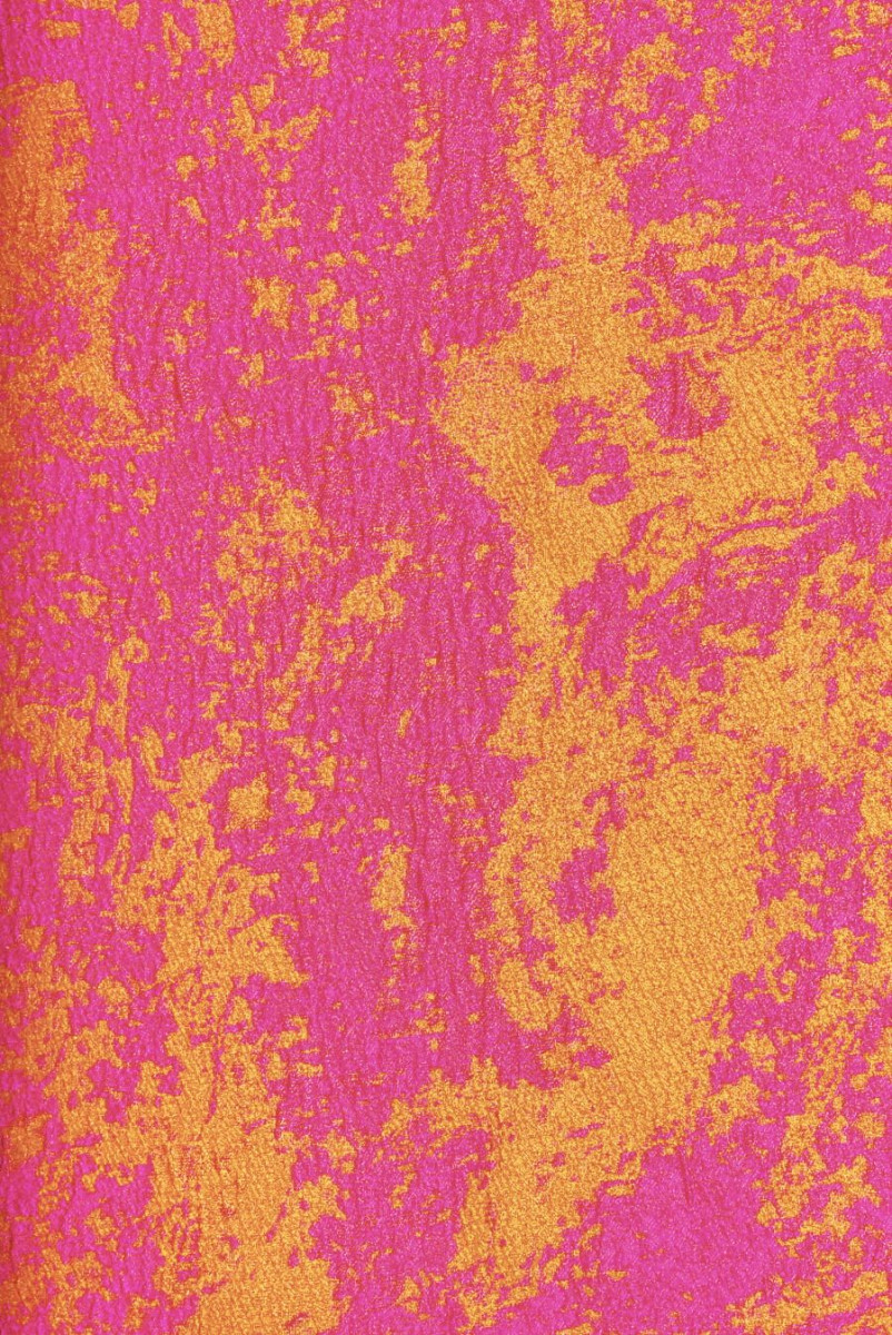 Жакардова тканина виткана цікавим, абстрактним візерунком з двох кольорів ниток: рожевого і помаранчевого. Неправильні мотиви чіткі і досить великі. Тканина тонка, але непрозора, нееластична, трохи жорстка в розташуванні, як і тафта, має гарний блиск і ніжну, опуклу структуру. Унікальний матеріал ідеально підходить для вечірніх нарядів, таких як сукні, спідниці або жакети. Він також добре підійде в якості декоративної тканини.
