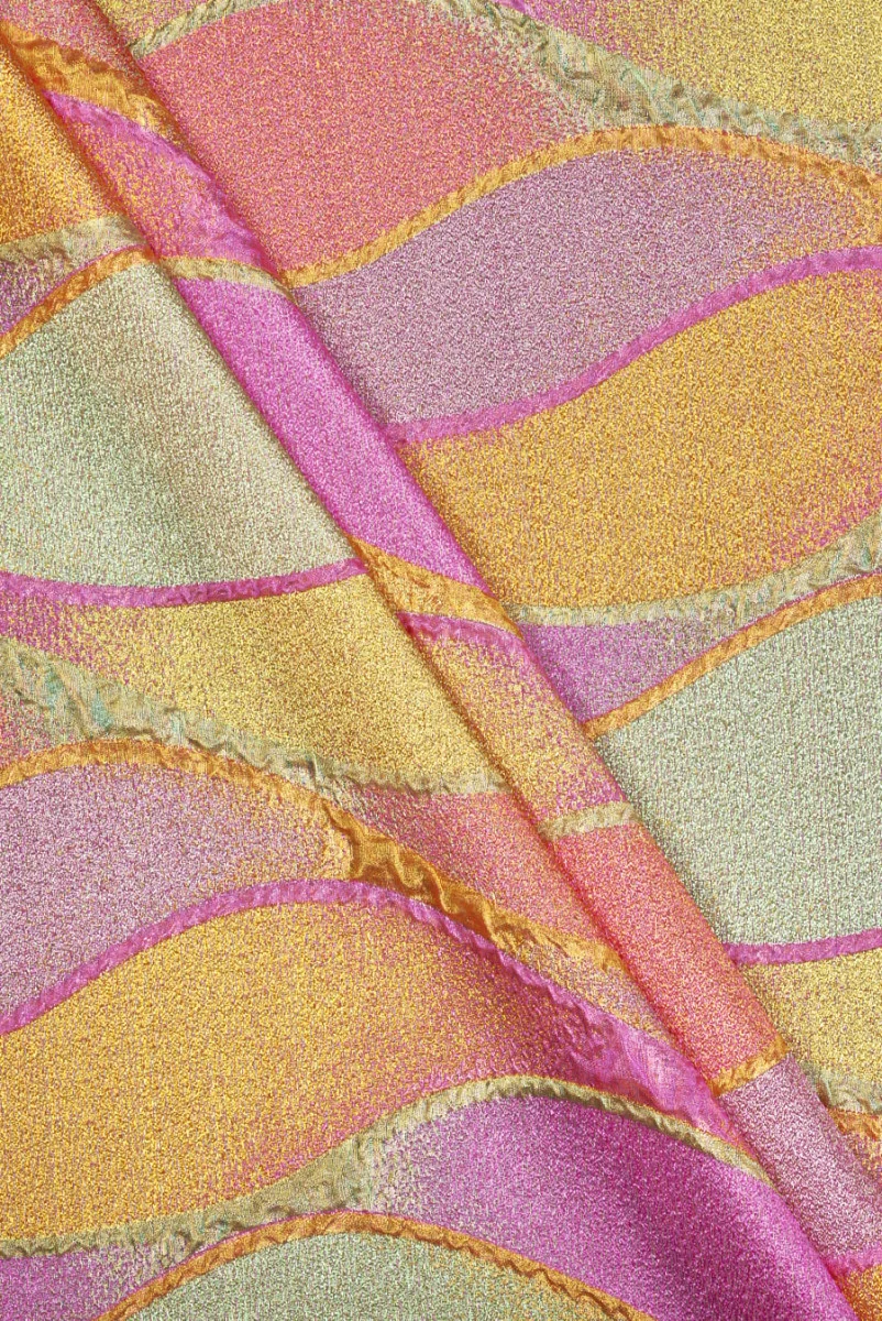 Жакардова тканина з мотивом, що нагадує барвистий вітраж. Досить великий, правильний візерунок, що складається з опуклих хвиль, де проміжки між ними заповнені блискучими нитками, що утворюють ніжну структуру. Весь виконаний у відтінках рожевого, помаранчевого та салатового. Тканина тонка, але непрозора, легка, нееластична, розкладка трохи жорстка, але м'яка в хваті. Оригінальна пропозиція в свіжих літніх кольорах ідеально підійде до суконь, спідниць, жакетів і навіть легких пальто.