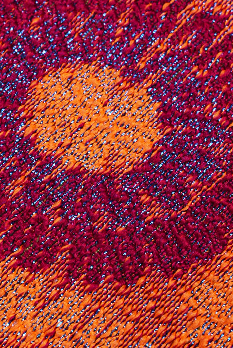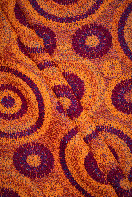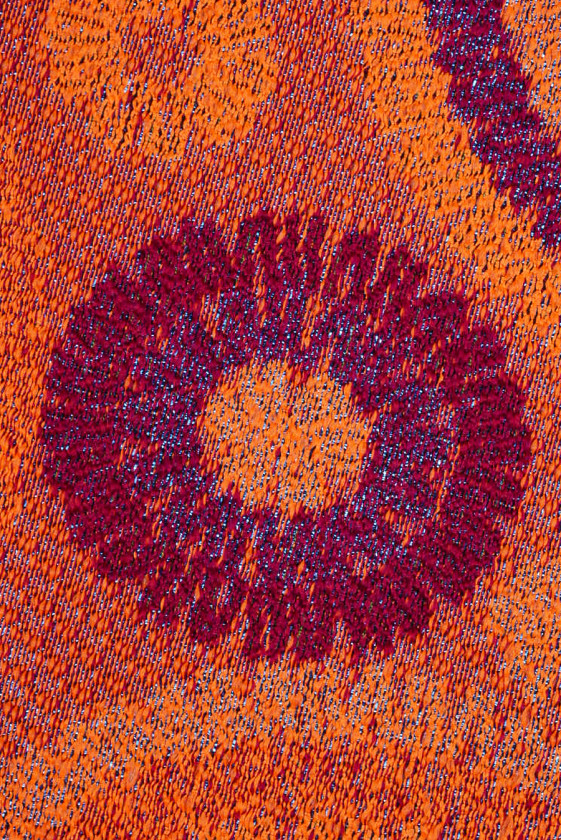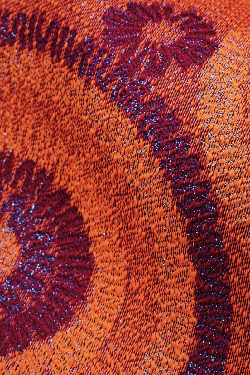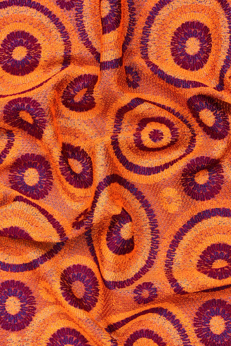 Жакардова тканина з мотивом різнокольорових розеток різних розмірів на соковитому помаранчевому тлі. Щільний, правильний візерунок виконаний в двох відтінках помаранчевого і темно-рожевого, і весь прикрашений блискучою волошковою ниткою. Найбільша розетка має ширину 19 см, менші - 11 см, 8 см і 4 см. Тканина досить тонка, але непрозора, нееластична, легка і сидить трохи жорстко, а блискуча нитка красиво відбиває світло. Переплетення злегка опукле. Унікальний матеріал, який ідеально підходить для суконь, спідниць, жакетів або легких пальто.