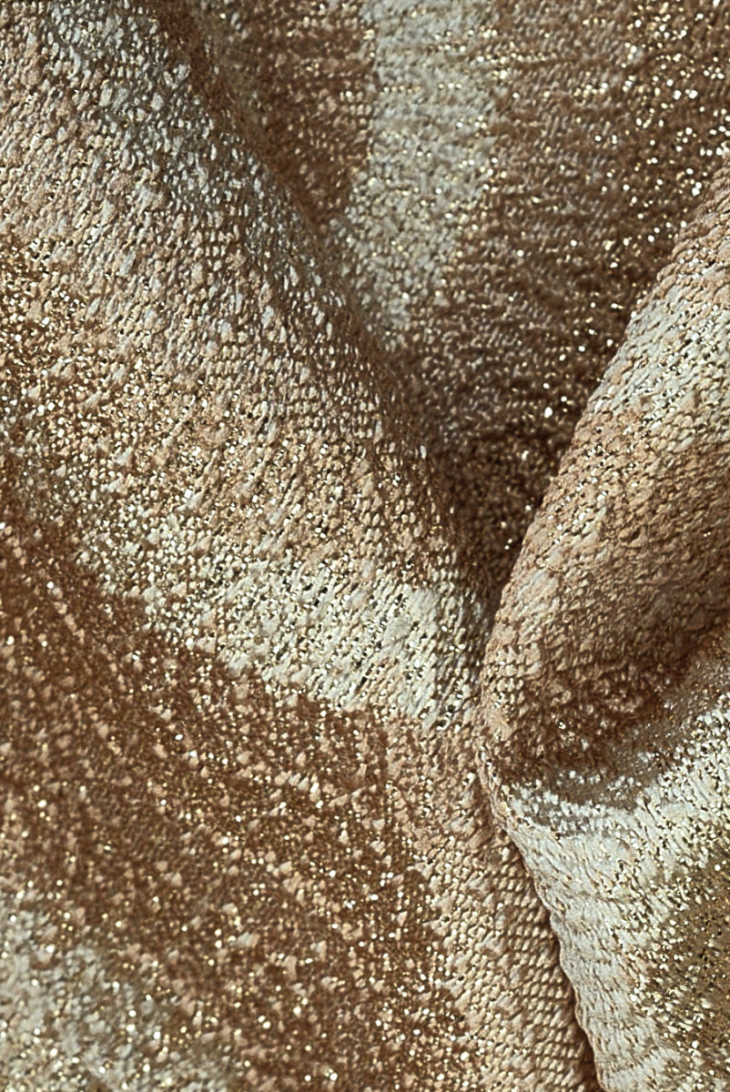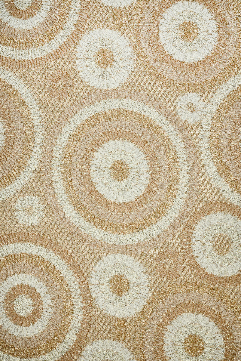 Жакардова тканина з бежевим мотивом розетки різних розмірів на бежевому тлі. Щільний, правильний візерунок виконаний з ниток світло-темного бежевого кольору, а весь прикрашений блискучою золотою ниткою. Найбільша розетка має ширину 19 см, менші - 11 см, 8 см і 4 см. Тканина досить тонка, але непрозора, не еластична, легка і злегка жорстко сидить. Унікальний матеріал у приглушеному кольорі, який ідеально підійде для суконь, спідниць, курток або легких пальто.