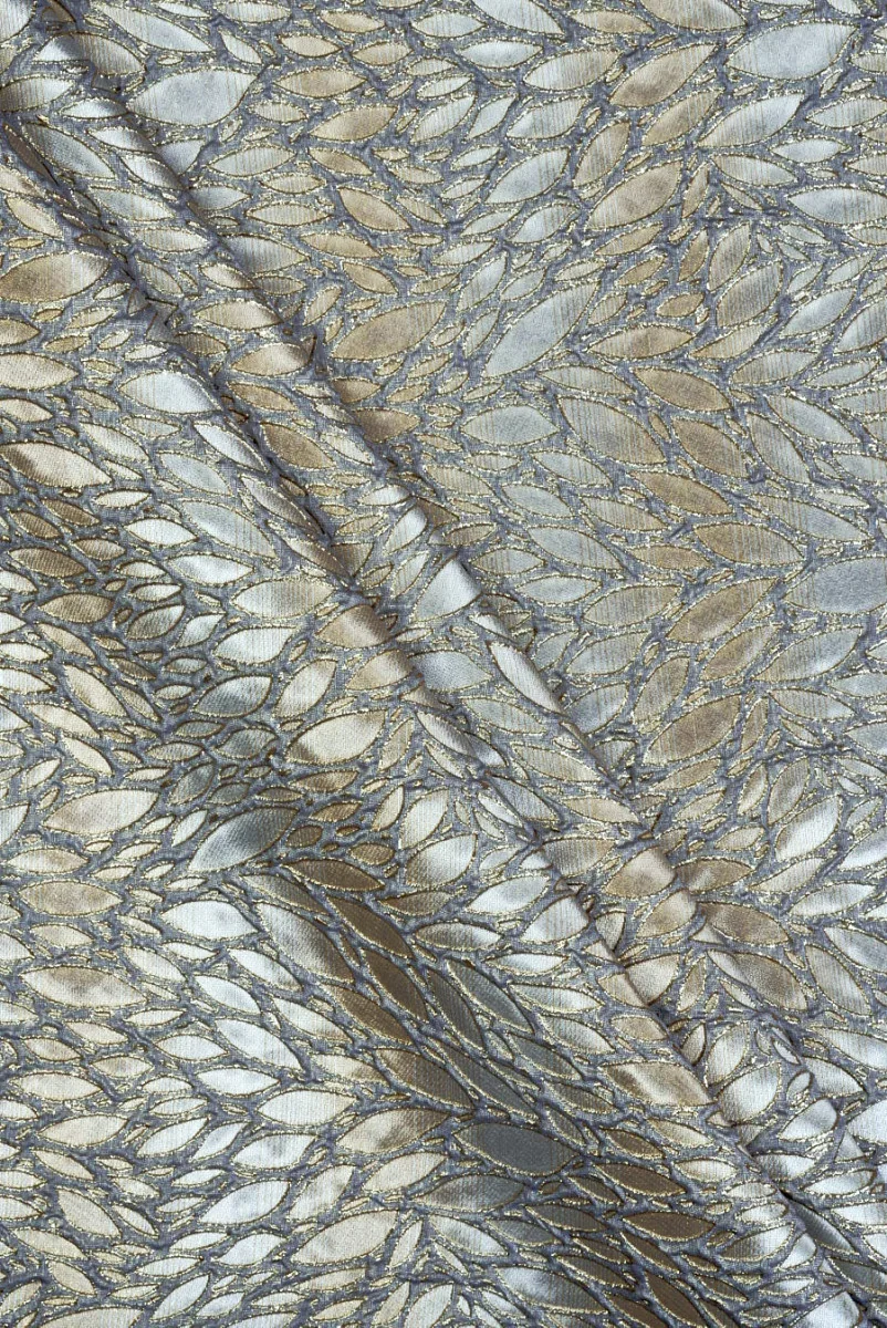 Поліефірна жакардова тканина з мотивом у формі листа в світло-сірій облямівці. Дуже щільно розміщені мотиви мають різні розміри, найменший - 5 мм і найбільший - 5 см, вони наповнені блискучою ниткою двох відтінків бежевого. Більш теплий і холодний бежевий плетуть по черзі через кожні 4 см, створюючи смуги, що дають цікавий ефект розтушовування. Сірі облямівки, навпаки, опуклі. Тканина легка, нееластична, середньої товщини і досить жорстко сидить. Його можна використовувати для створення вечірніх нарядів, таких як сукні, спідниці, жакети.