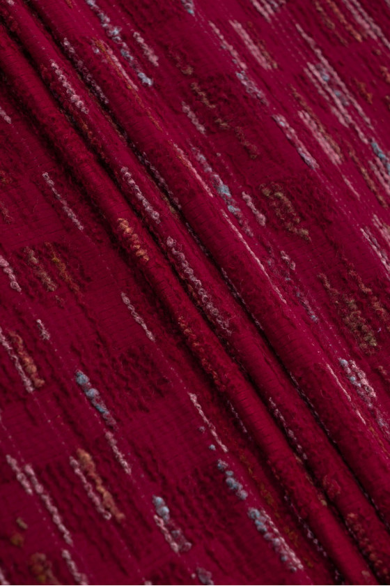Жаккард витканий з сумішей волокон-віскози, вовни і поліестеру, вишнево-червоного кольору з переплетеними різнокольоровими нитками. Цікава пропозиція для пошиття жакетів, суконь або кардиганів.