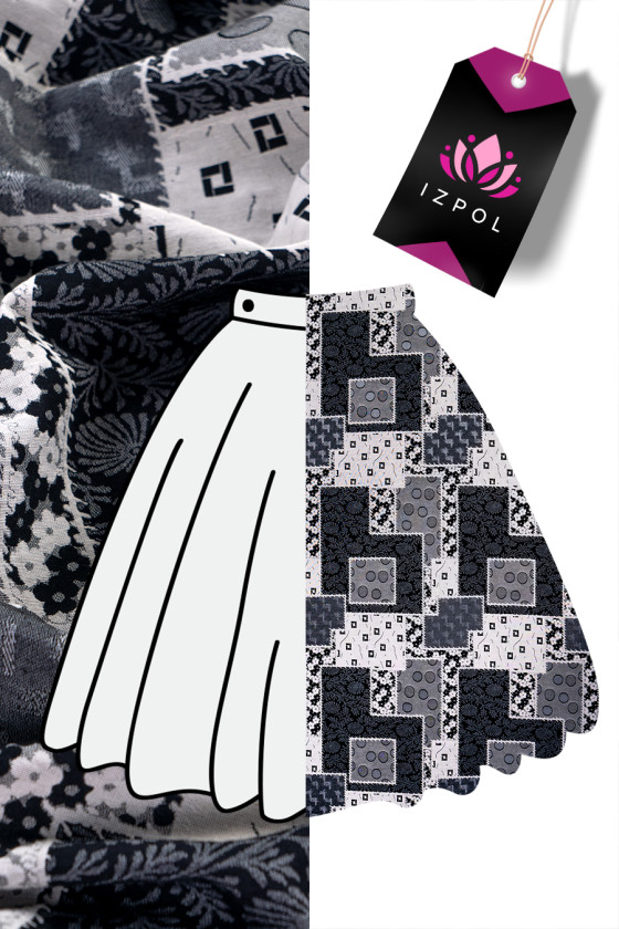 Жакардова тканина, виткана з віскозних і поліефірних ниток. Візерунок створює модний в цьому сезоні печворк. Ми рекомендуємо шити сукні, костюми, тонкі пальто або використовувати їх як тканину для прикраси інтер'єру.