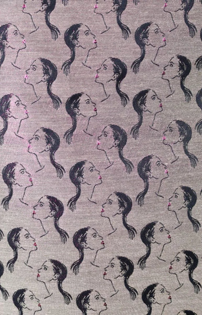 Італійська жакардова костюмна тканина. Тканина має дуже оригінальний колір фону, адже качок виконаний з двох кольорів ниток: бежевого і блискучого, пурпурового. Основа, навпаки, чорна. Таке поєднання змушує матеріал красиво виблискувати в залежності від кута падіння світла. Візерунок складається з численних облич жінки в чорному кольорі з рожевими блискучими губами. Грані розміром 4 см, по черзі повернуті один раз вправо і один раз вліво.