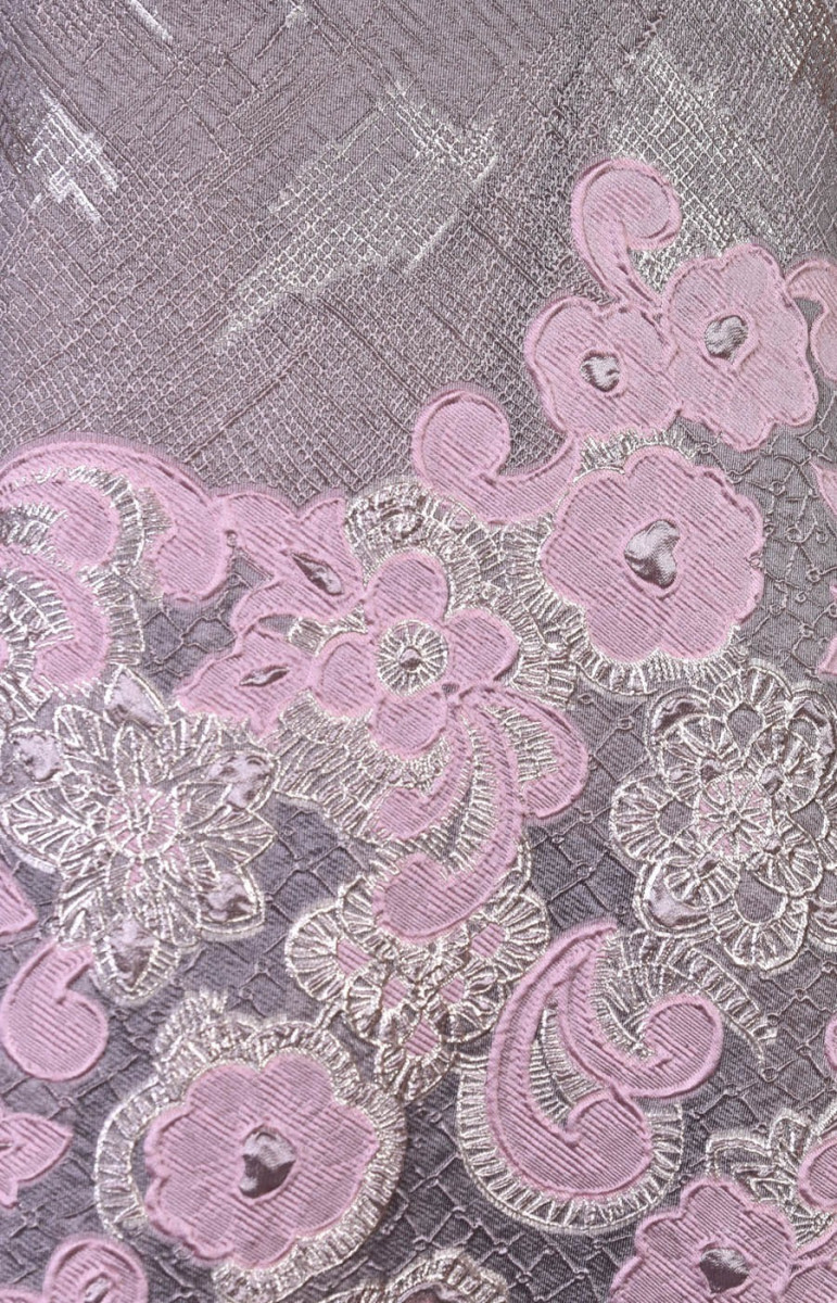 Дуже багата жакардова костюмна тканина брудно-рожевого і золотого кольору з квітковим мотивом по одному краю - тканина прошита по колу. Тканина м'яка, нееластична, злегка прозора.