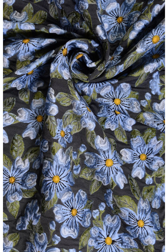 Італійська жакардова костюмна тканина з квітковим мотивом. Утворює дуже щільний візерунок з синіх квіток, оточених зеленим листям на сіро-чорному тлі. Тканина злегка жорстка зі злегка зім'ятою структурою. Фантастична пропозиція для любителів квіткових мотивів. Тканина ідеально підходить для пошиття костюма, спідниці або декоративного пальто, або навіть як декоративна тканина, наприклад, для подушок.