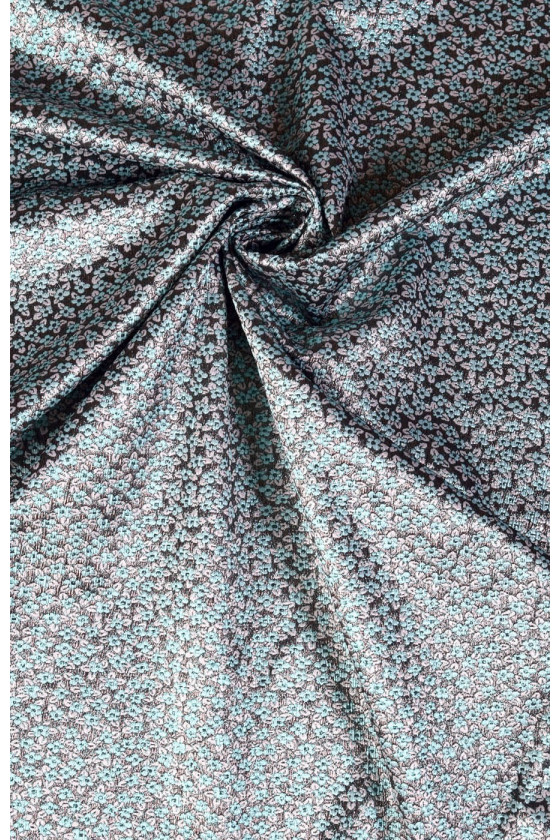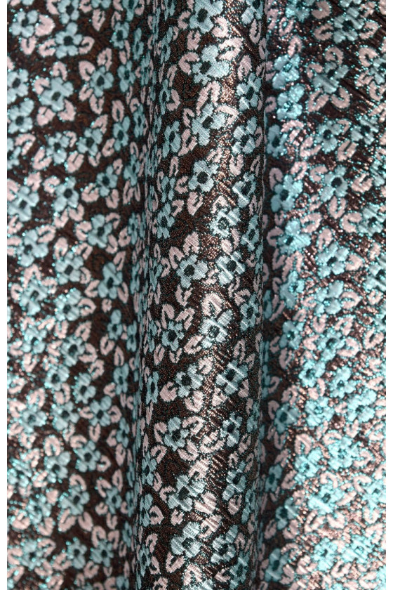Елегантний жаккард з дрібним візерунком лугових квітів. Тканина злегка жорстка і легка, з глянцем. Ідеально підходить для жакетів, суконь, спідниць і тонких офіційних пальто.