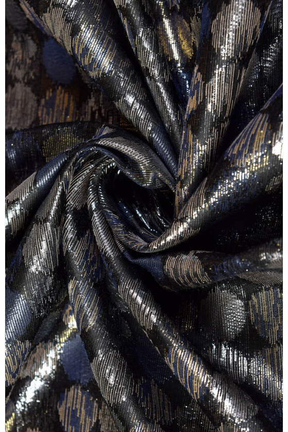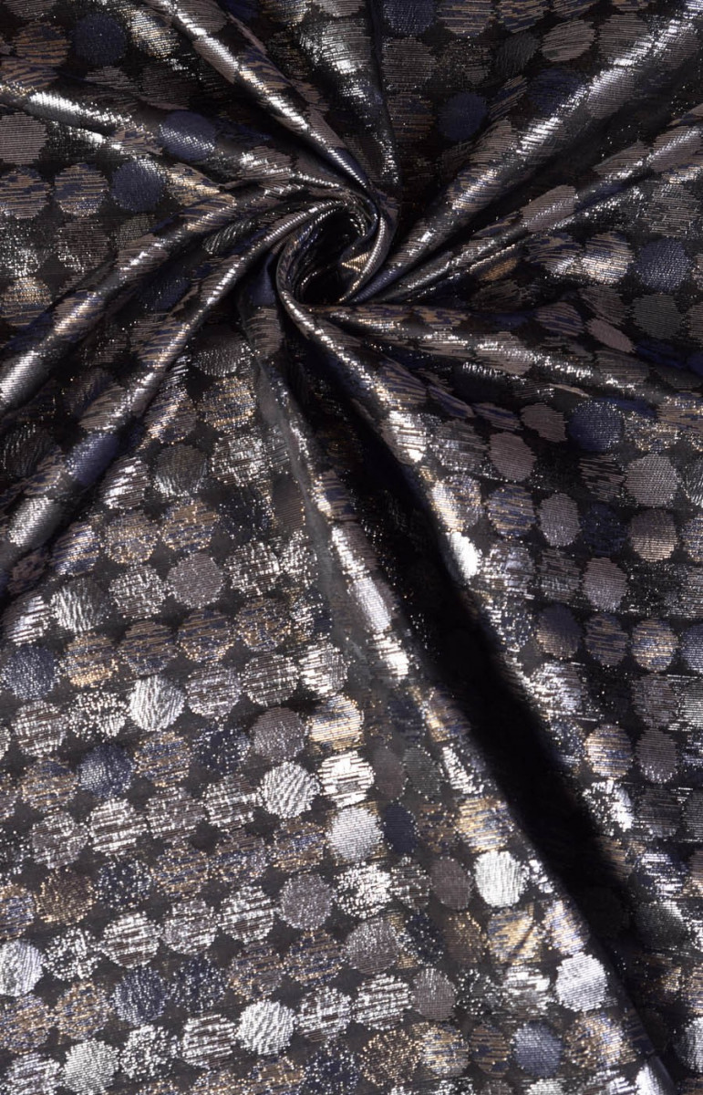 Італійська жакардова тканина темно-графітового кольору з щільним малюнком з блискучих кіл. Тканина тонка, злегка жорстка і легка. Ідеально підходить для пошиття суконь, спідниць і парадних жакетів. Його можна використовувати в якості декоративної тканини.