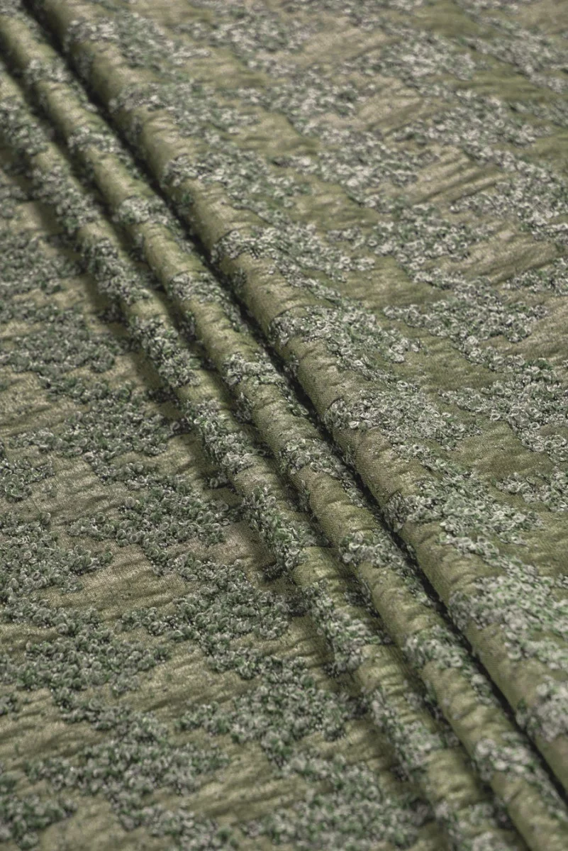 Жакардова куряча лапка букле, сплетена з поліестеру, оливково-зеленого кольору. Більш щільна, нееластична, глянцева тканина. Цікава пропозиція для пошиття курток або тонких пальто.