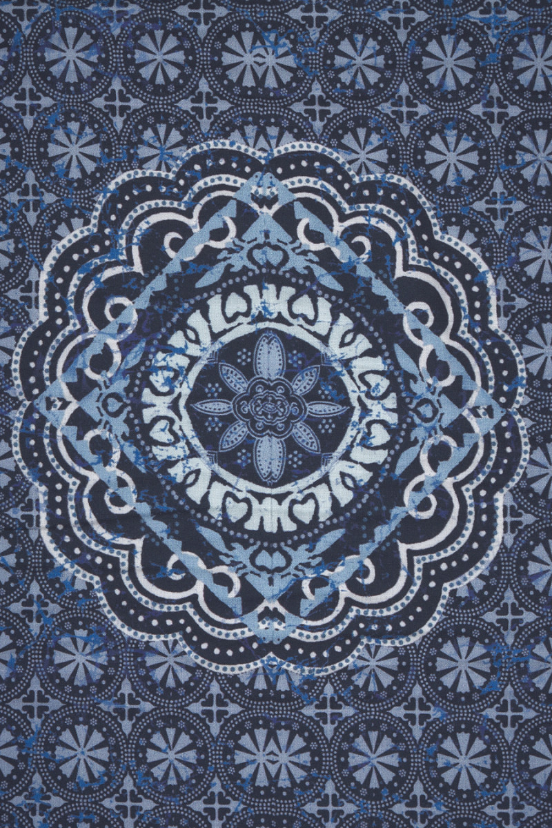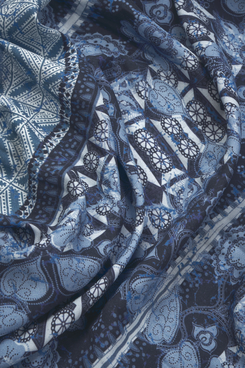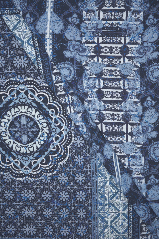 Itāļu 100% viskozes audums kupona izmērā 90 cm* 165 cm. Audums tumši zilā un violetā krāsā ar austrumu motīvu divu taisnstūru veidā, kuru izmērs ir 55 cm * 80 cm, pabeigts ar 10 cm robežām pie eģēm un kupona apakšā. Viskoze ir audums, kas iegūts no celulozes, ļoti elpojošs un mīksts, tas ir ādai draudzīgs (nav alerģisks) un lieliski absorbē mitrumu. Neelastīgs, necaurspīdīgs audums - ideāli piemērots vasaras kleitas, blūzes vai svārku šūšanai.