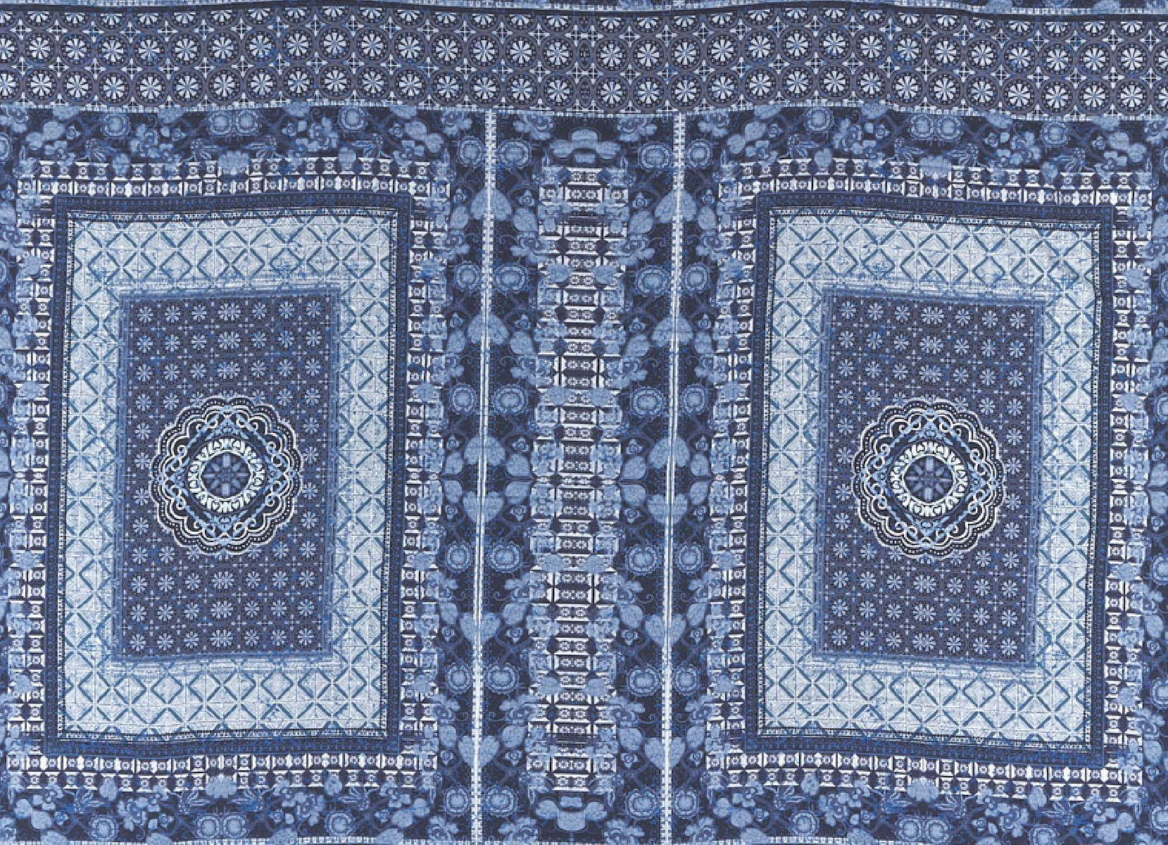 Itāļu 100% viskozes audums kupona izmērā 90 cm* 165 cm. Audums tumši zilā un violetā krāsā ar austrumu motīvu divu taisnstūru veidā, kuru izmērs ir 55 cm * 80 cm, pabeigts ar 10 cm robežām pie eģēm un kupona apakšā.