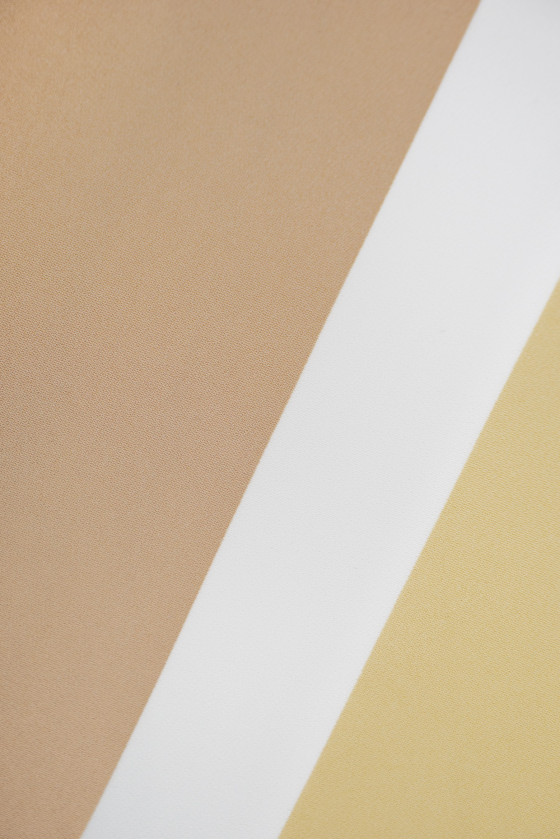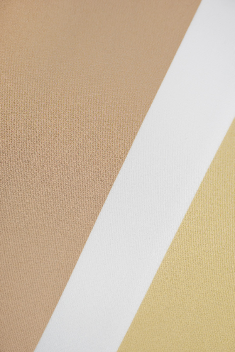 Italian cadi type viscose fabric with stripes 3.5 cm and 10 cm wide, in the following colors: black, écru, beige and yellow-beige. Cadi fabric is opaque, fleshy, flowing (heavy).