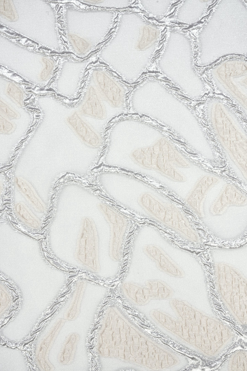Poliészter organza szövet ezüst színű jacquard motívummal és nagyon világos, hideg bézs színnel. A közepes méretű minták sűrűn és szabálytalanul vannak elrendezve és domborúak, az organza pedig finom ezüstszállal van ellátva. Az anyag átlátszó, vékony, nem rugalmas, enyhén merev és gyönyörűen fényes. Nagyszerű ajánlat estélyi ruhákhoz, szoknyákhoz vagy blúzokhoz.