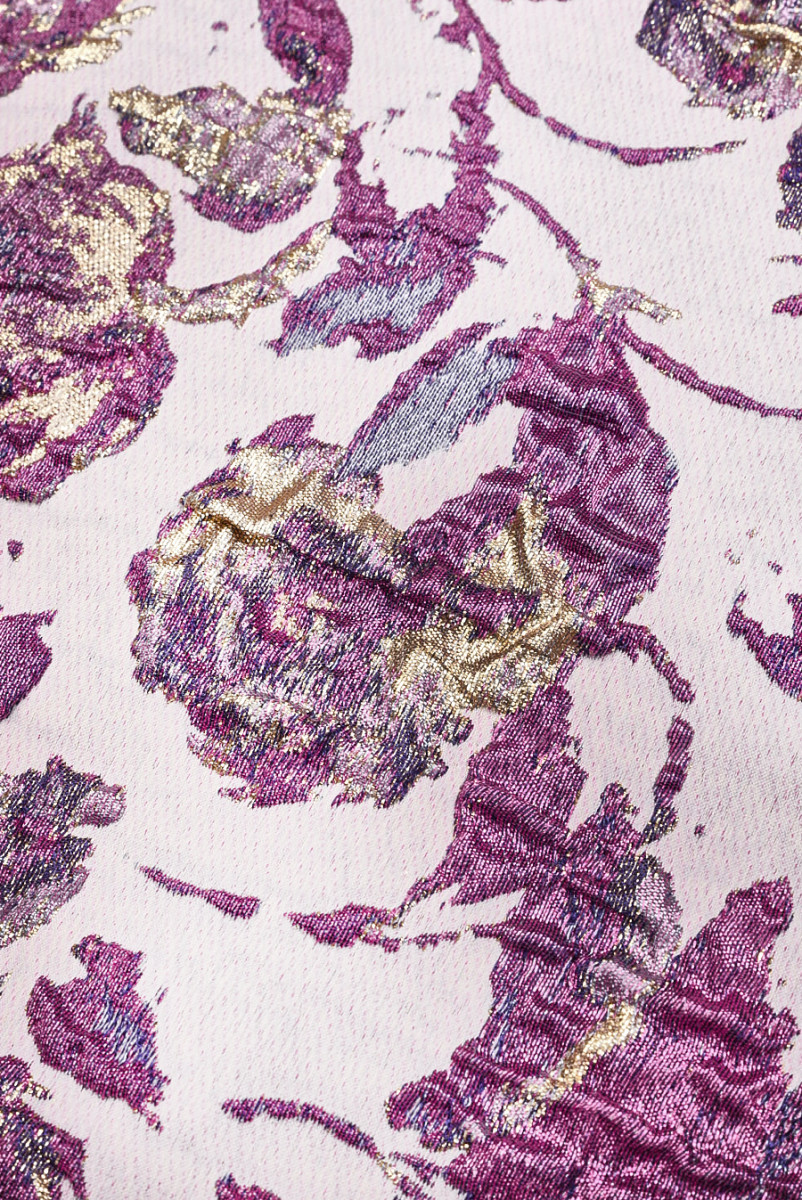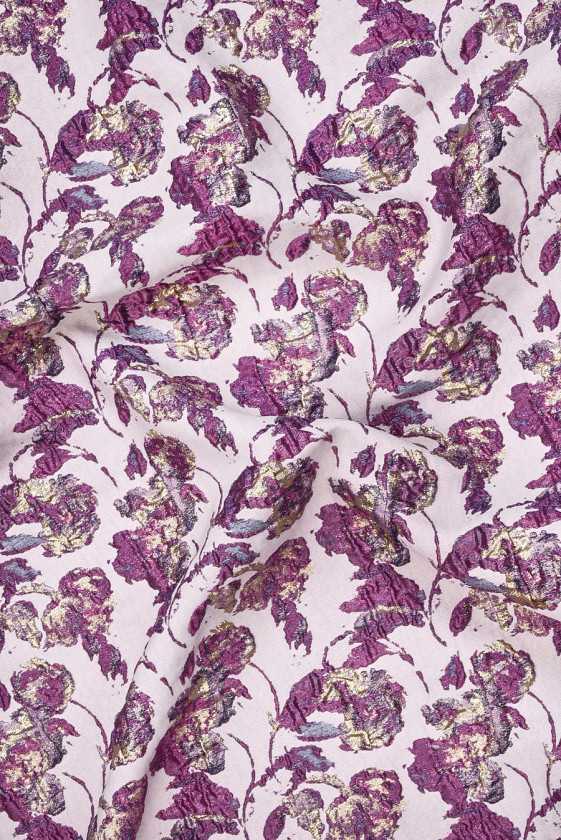 Jacquard fabric with a motif resembling flowers in purple and gold on a pink, matte background. A dense and convex pattern, where a single element is about 7 cm * 8 cm in size and is made of shiny threads. The fabric is quite thin but opaque, inelastic, soft in the grip and fits slightly stiffly. A romantic proposition from which you can create dresses, skirts, jackets, vests.