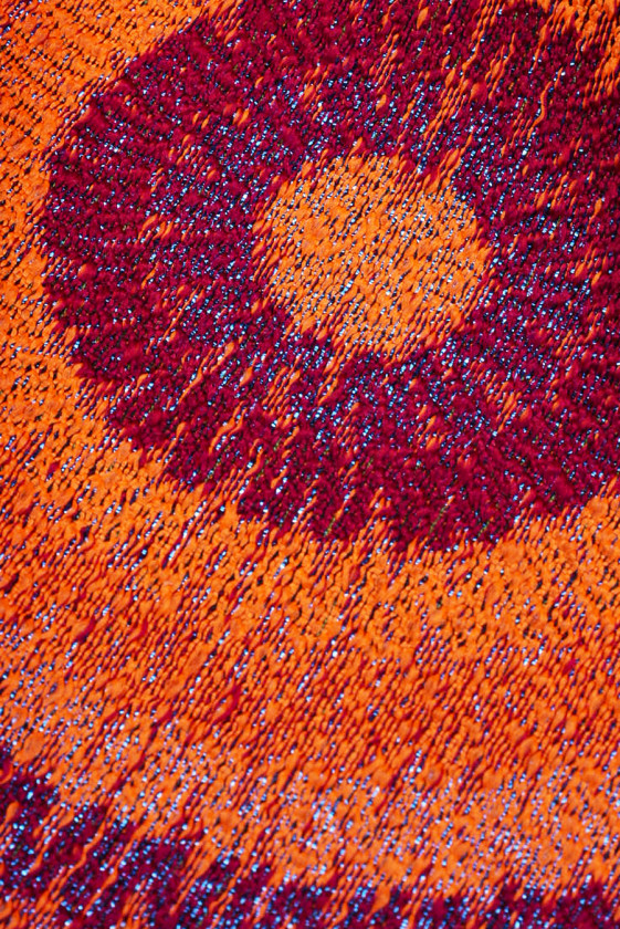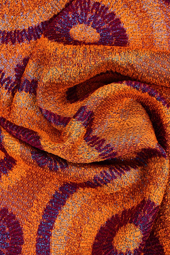 Žakárová látka s motívom farebných roziet v rôznych veľkostiach na šťavnatom oranžovom pozadí. Hustý, pravidelný vzor vyrobený v dvoch odtieňoch oranžovej a tmavo ružovej a celok zdobí lesklá nevädza modrá niť. Najväčšia rozeta je široká 19 cm, menšie sú široké 11 cm, 8 cm a 4 cm. Látka je pomerne tenká, ale nepriehľadná, nepružná, ľahká a trochu tuho sedí a lesklá niť krásne odráža svetlo. Väzba je mierne konvexná. Jedinečný materiál, ktorý je ideálny na šaty, sukne, bundy alebo ľahké kabáty.
