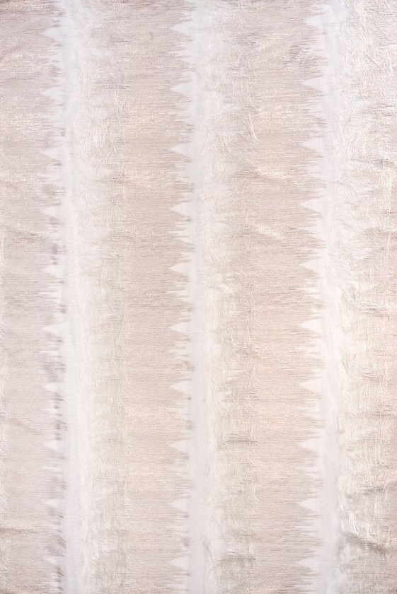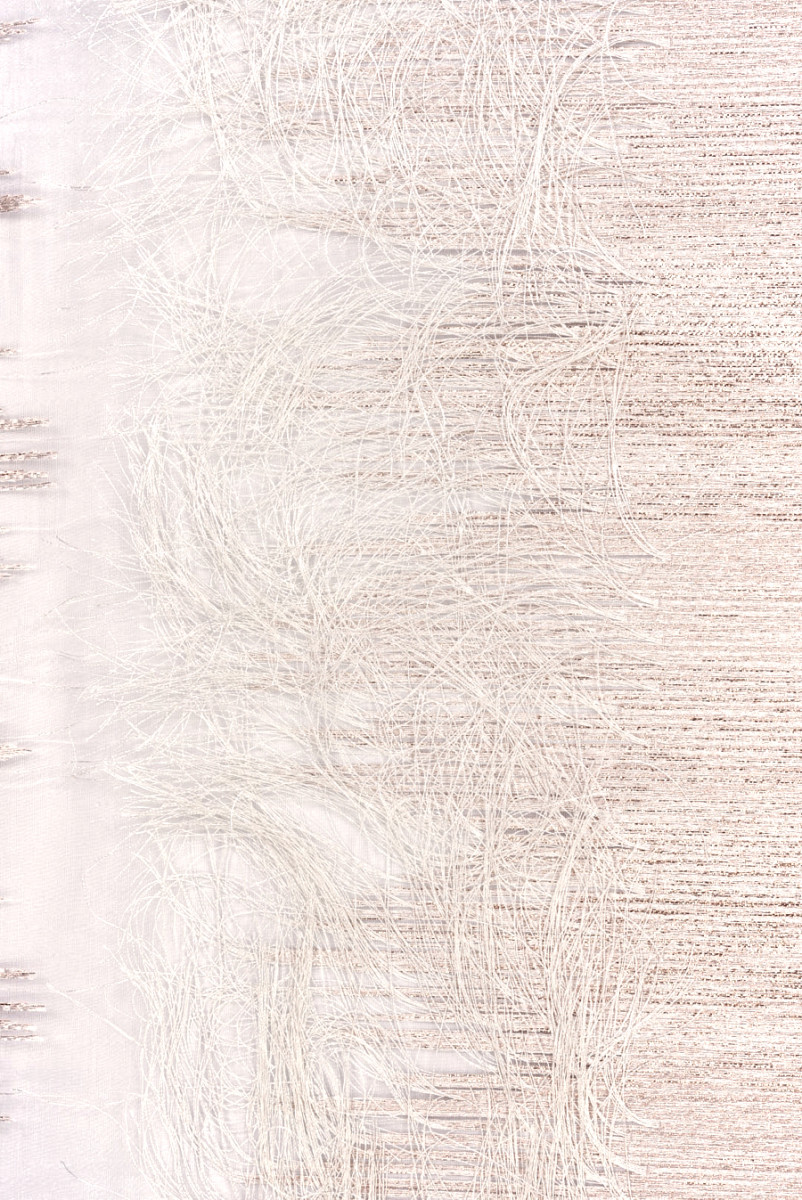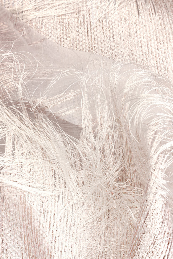 Krémová organzová polyesterová tkanina so žakárovým motívom zobrazujúcim husto usporiadané línie rôznych dĺžok v krémovej farbe. Pravidelné vzory so šírkou 30 cm sa opakujú v 8 cm intervaloch v najširšom mieste a sú bohato zdobené lesklou niťou z ružového zlata, ktorá dodáva látke zaujímavú, jemne ružovú farbu. Každý motív je zakončený strapcami dlhými asi 9 cm. Vzhľadom na usporiadanie strapcov odporúčame obvodové šitie. Látka je tenká, miestami bez tkaného vzoru priehľadná, neelastická, mierne tuho sedí, ale vďaka strapcom získava peknú vzdušnosť. Tento jedinečný materiál odporúčame najmä na šaty a sukne.