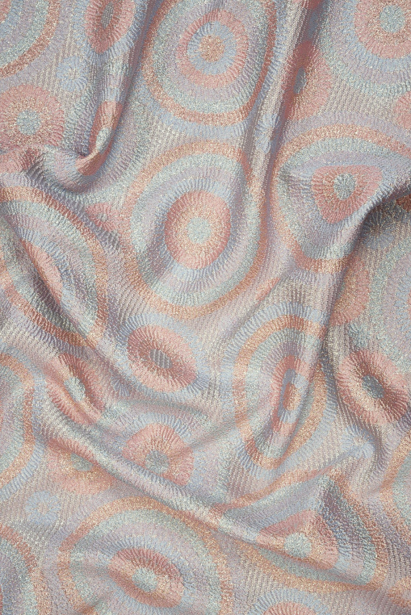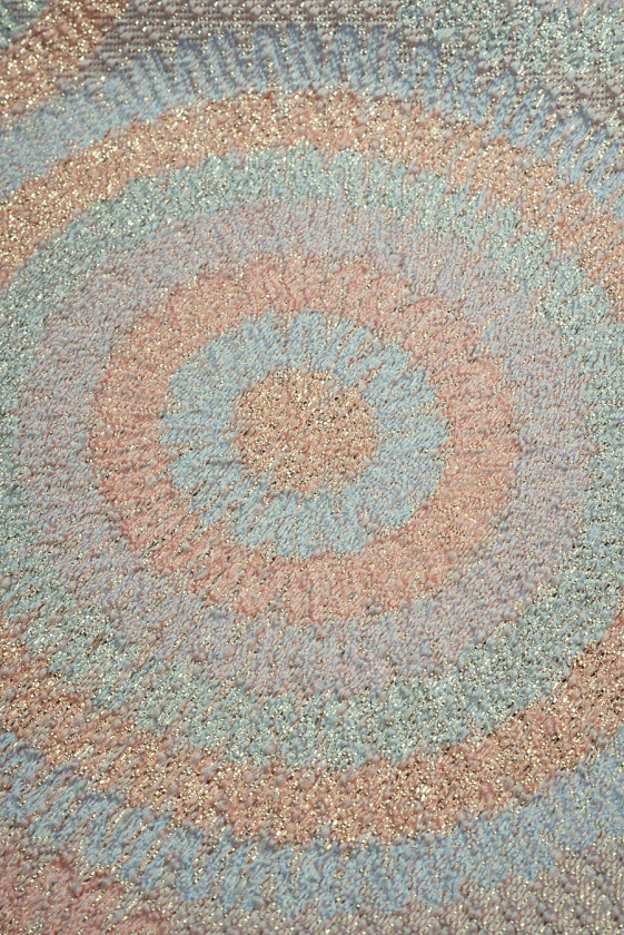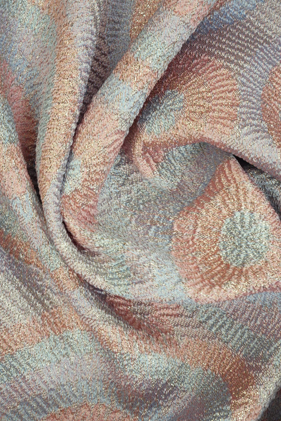 Žakaarkangas heledal taustal erineva suurusega pastelsete rosettide motiiviga. Tihe korrapärane muster, mis on valmistatud pastellsinisest, lillast ja lõheroosast niidist ning kogu on kaunistatud läikiva kuldse niidiga. Suurim rosett on 19 cm lai, väiksemad 11 cm, 8 cm ja 4 cm laiad. Kangas on üsna õhuke, kuid läbipaistmatu, mitteelastne, kerge ja istub veidi jäigalt. Ainulaadne materjal, mis sobib suurepäraselt kleitide, seelikute, jakkide või heledate mantlite jaoks.