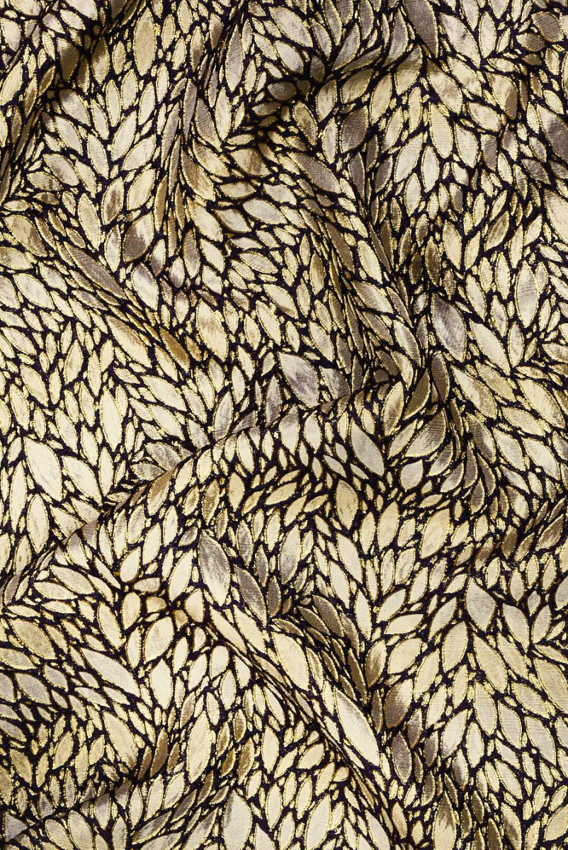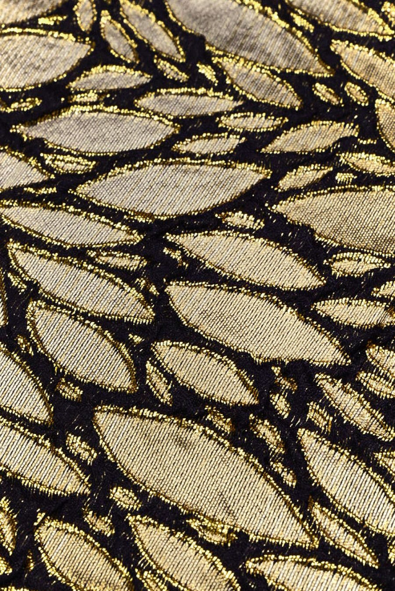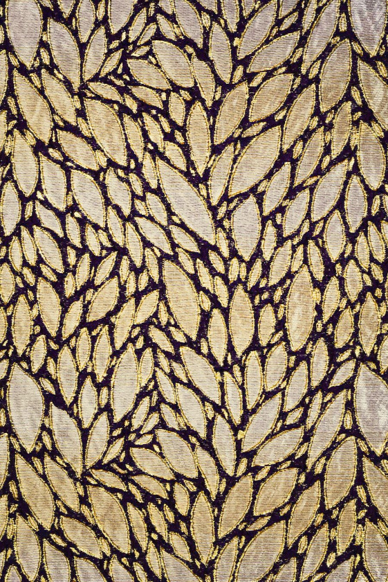 Polyesterová žakárová látka s motívom listu v tmavomodrej, takmer čiernych okrajoch. Veľmi husto umiestnené motívy majú rôzne veľkosti, najmenší je 5 mm a najväčší 5 cm, sú vyplnené lesklou niťou v dvoch odtieňoch zlata. Teplejšie a chladnejšie zlato sa tkajú striedavo každé 4 cm, čím sa vytvárajú pruhy, ktoré vytvárajú zaujímavý efekt tieňovania. Námornícke modré okraje sú naopak konvexné. Látka je ľahká, neelastická, strednej hrúbky a pomerne tuho sedí. Dá sa použiť na vytvorenie večerných outfitov, ako sú šaty, sukne, bundy.