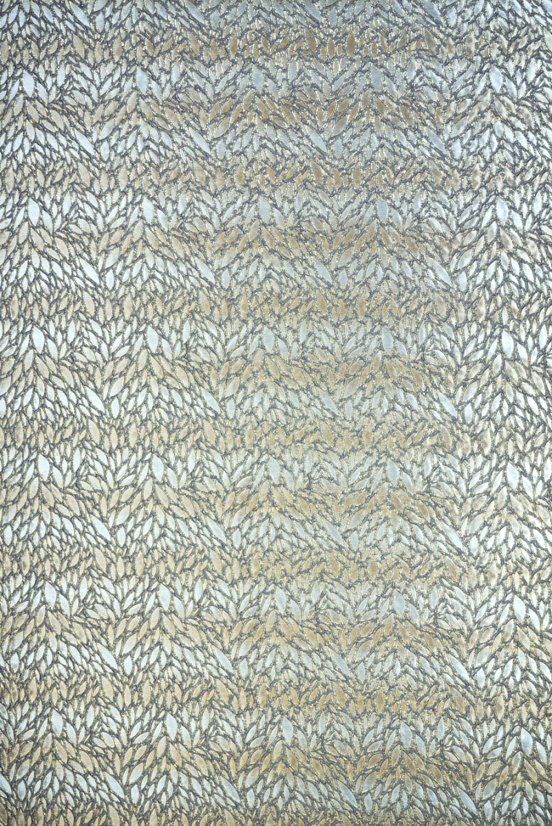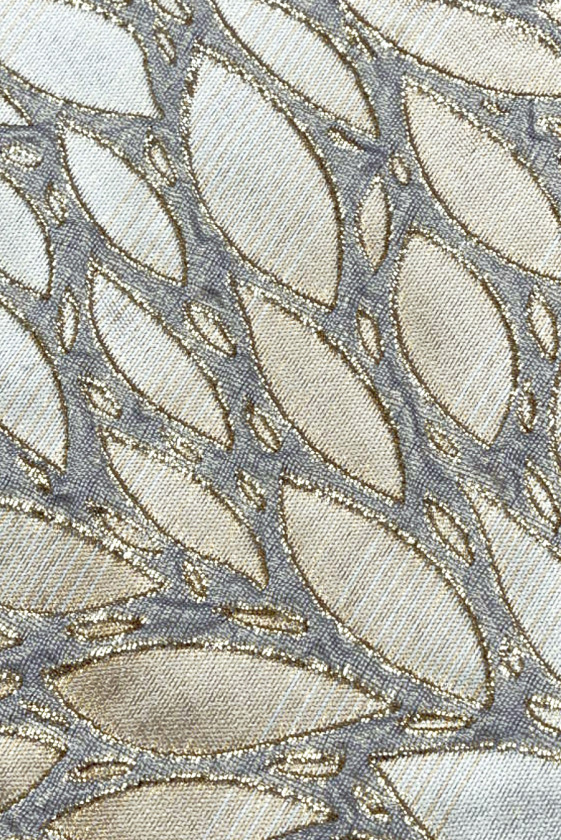Polyesterová žakárová tkanina s motívom v tvare listu v svetlošedých okrajoch. Veľmi husto umiestnené motívy majú rôzne veľkosti, najmenší je 5 mm a najväčší 5 cm, sú vyplnené lesklou niťou v dvoch odtieňoch béžovej. Teplejšia a chladnejšia béžová sa tkajú striedavo každé 4 cm a vytvárajú pruhy, ktoré dodávajú zaujímavý efekt tieňovania. Sivé okraje sú naopak konvexné. Látka je ľahká, neelastická, strednej hrúbky a pomerne tuho sedí. Dá sa použiť na vytvorenie večerných outfitov, ako sú šaty, sukne, bundy.