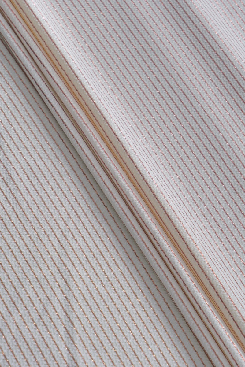 Italian jacquard costume fabric in écru color with stitching made of shiny copper thread. They form horizontal stripes about 0.7 cm wide. The fabric is slightly stiff, non-elastic, elegant - perfect for sewing a dress, skirt, costume or coat.
