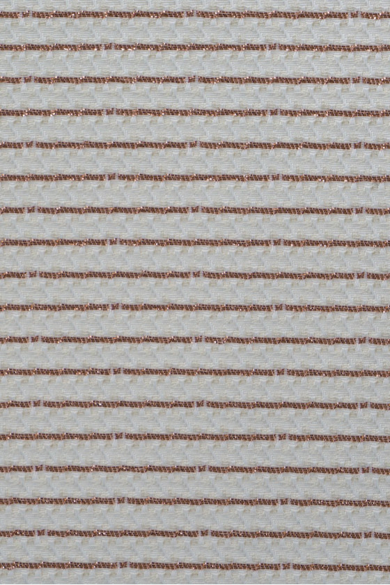 Talianska žakárová kostýmová látka vo farbe écru s prešívaním z lesklej medenej nite. Tvoria vodorovné pruhy široké asi 0,7 cm. Látka je mierne tuhá, neelastická, elegantná - ideálna na šitie šiat, sukne, kostýmu alebo kabáta.