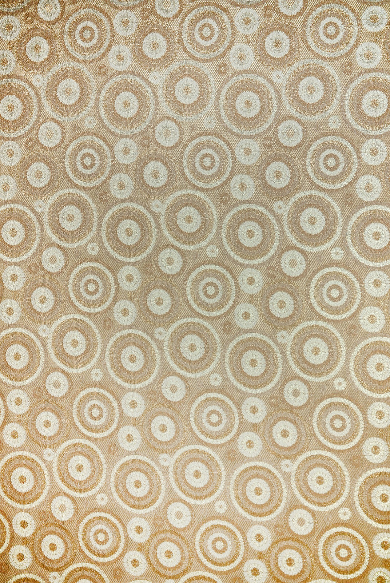 Jacquard fabric with a beige rosette motif in various sizes on a beige background. A dense, regular pattern made of thread in light and dark beige, and the whole is decorated with shiny gold thread. The largest rosette is 19 cm wide, the smaller ones are 11 cm, 8 cm and 4 cm wide. The fabric is quite thin, but opaque, non-elastic, light and fits slightly stiffly. A unique material, in a subdued color that will be perfect for dresses, skirts, jackets or light coats.